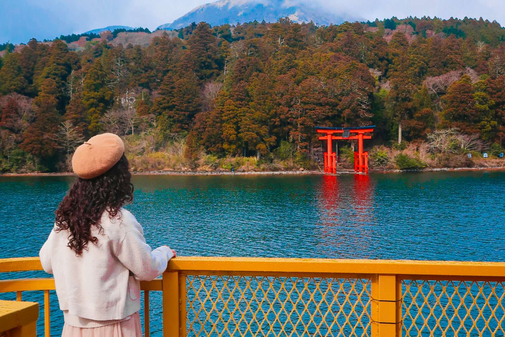 From there, it’s just a short walk to the atmospheric grounds of Hakone Shrine, famous for its vermilion torii gate rising from the waters of Lake Ashi. On clear days, the scene becomes even more magical with Mount Fuji visible in the distance.