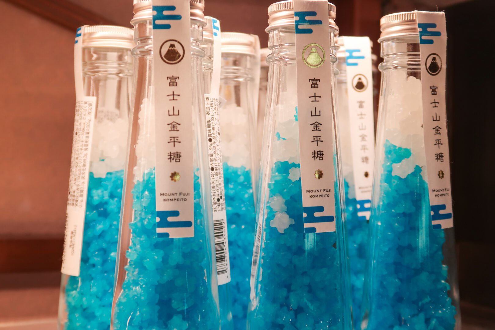 Hakone-no-Ichi Shop inside Hakone-Yumoto Station. Conveniently positioned just before the ticket gates, the shop is the perfect place to pick up a few Hakone souvenirs before returning to Tokyo. Shelves were filled with countless local specialties and beautifully packaged treats, but the Mt. Fuji-themed gifts immediately caught my eye. From delightfully crumbly Mt.Fuji-shaped sable cookies to tins of fragrant matcha decorated with cranes and Japan’s iconic peak, and even colorful Mt. Fuji-shaped “konpeito” sugar candies (pictured).