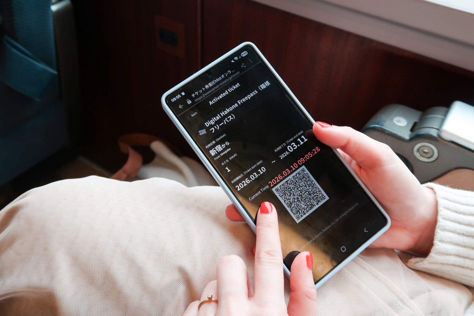 On the day of travel, I found it incredibly easy to use. Once activated, simply tap “Show Ticket” to display the QR code and scan it at the ticket gates or show the screen to staff where scanners aren’t available. For the trip from and to Shinjuku Station, I also added a limited express ticket (an extra 1,150 yen each way) via Emot to ride the comfortable Odakyu Romancecar, and I was able to select my seat at the time of purchase. Before long, Tokyo’s dense cityscape began to fade into rolling mountains, marking the start of a smooth and scenic journey to Hakone.