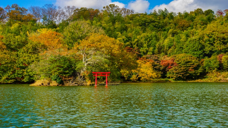 Lake Ippekiko is a stunning volcanic lake formed approximately 100,000 years ago by a volcanic eruption. Spanning about 4 kilometers in circumference, its surface reflects the sky and the surrounding mountains, creating a beautifully azure scene often referred to as the "Eye of Izu." Particularly striking is the autumn foliage season, when crimson-colored trees adorn the lake, but the scenery shaped by nature across all four seasons is truly remarkable.