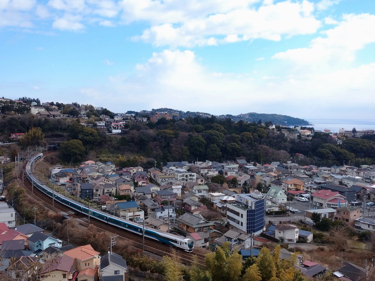 Upon arriving at Odawara Station, you’ll find the high-ceiling, open-concept platform resembling a modern airport terminal. Exit through the ticket gate and transfer to the JR Limited Express Odoriko train. The Odoriko travels mostly along the coast, offering great ocean views alongside mountain scenery. The route passes through historic resort towns like Atami and Yugawara, where the unique townscapes are also worth observing from the train.