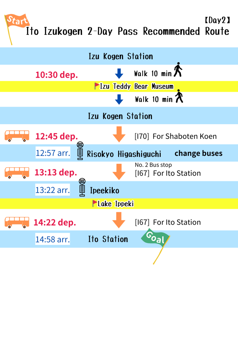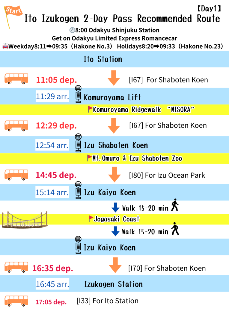 ①Izu Kaigan Koen bus stop at 4:35 p.m. ([I70] Shaboten Koen) → Izu-Kogen Station at 4:45 p.m. → Transfer at 5:35 p.m. ([I85] Ito Station) → Yotsuji bus stop at 5:38 p.m. → 4-minute walk