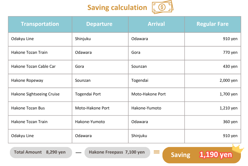 *The above shows the price difference between the adult fare for the two-day Hakone Freepass with round-trip discounted tickets from Shinjuku and the cost of purchasing individual tickets.