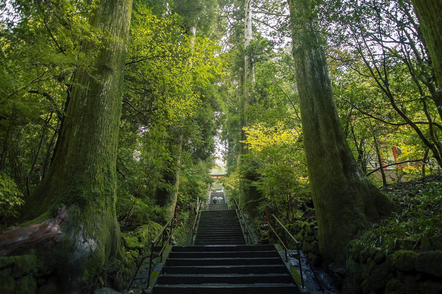 While strolling along Cedar Avenue, you'll arrive at Hakone Shrine in about a 40-minute walk. As evident from the constant stream of worshippers, Hakone Shrine is considered one of the top must-see spots in Hakone. It was established in the Nara period (757 AD) and enshrines three deities collectively called "Hakone Okami." At the shrine's entrance, a torii gate symbolizing peace stands tall against Lake Ashi, seemingly floating on the water's surface. Its mystical presence evokes a sense of reverence in onlookers. Keep walking along the approach and climb up the long stone steps. After passing through the fourth and fifth torii gates, you'll reach the main hall of the shrine.