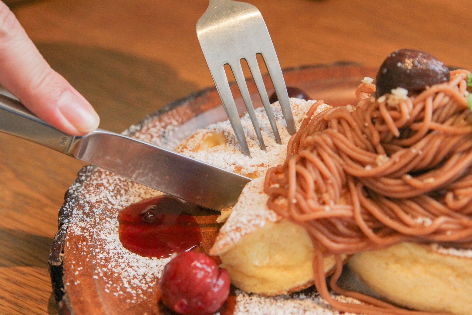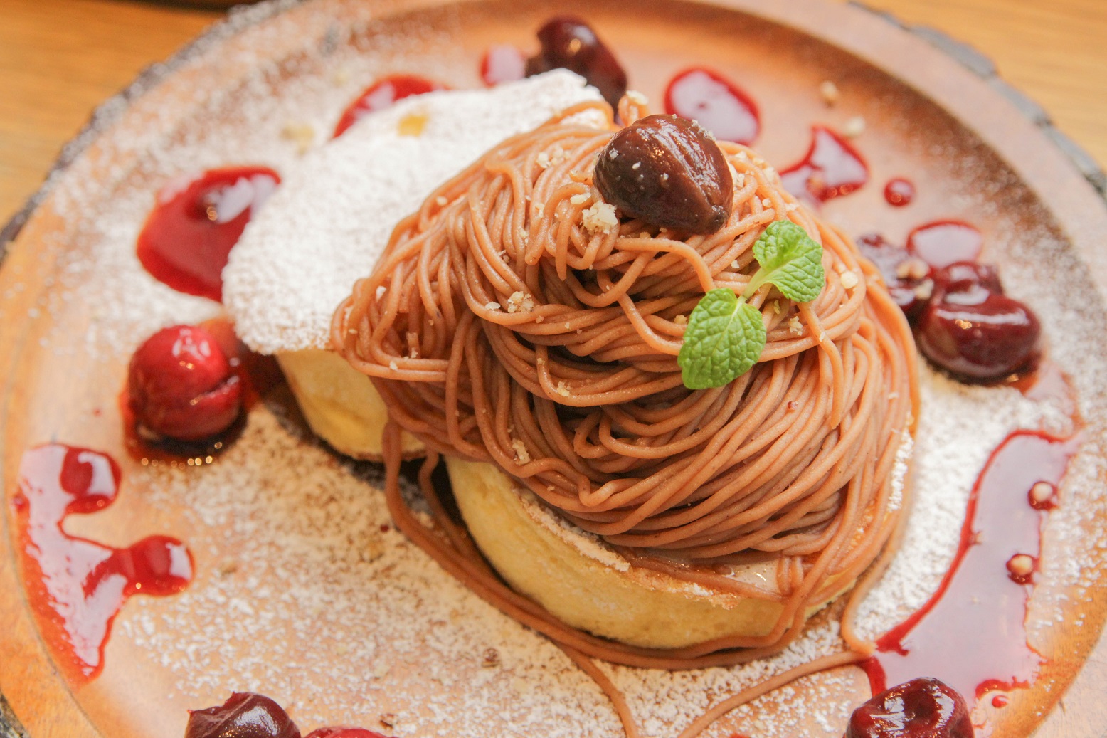 Also, the sweetness is refreshing, so it goes great with chocolate sauce and syrup! The "Chestnut and American Cherry Mont Blanc Pancakes'' we ordered this time around also matched the rich sweetness of the cream and the sourness of the cherry sauce, and we could not stop eating them.