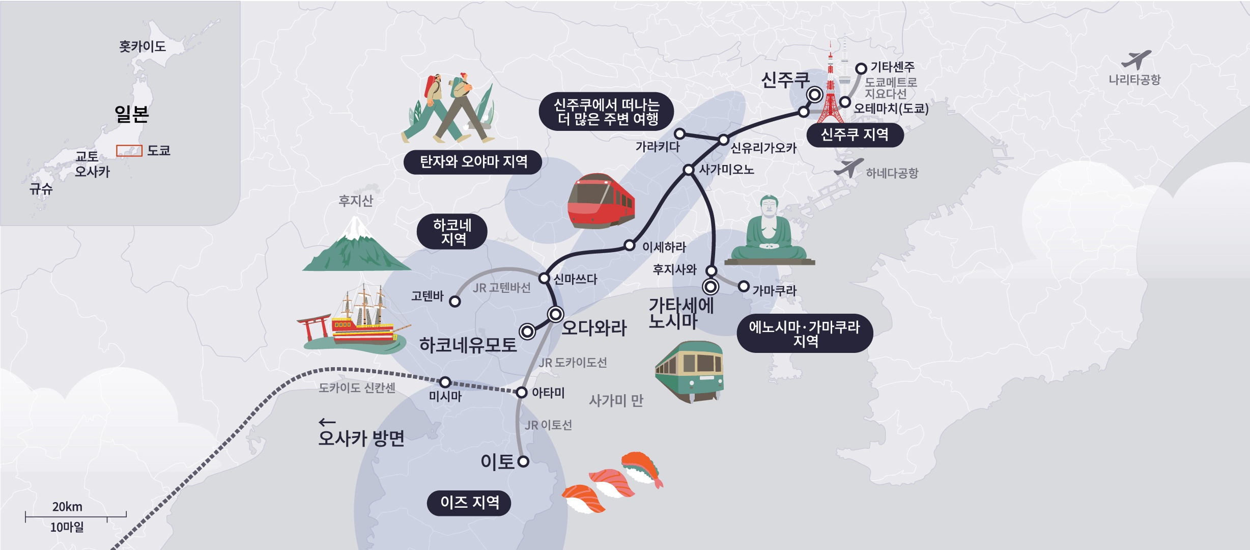 하코네로 가는 관문인 하코네유모토는 편안한 온천과 아름다운 경치로 유명합니다. 도쿄에서 오다큐 로망스카를 타고 약 80분이면 도착하며, 전통 료칸과 지역 음식, 자연을 즐기기에 이상적인 곳입니다.