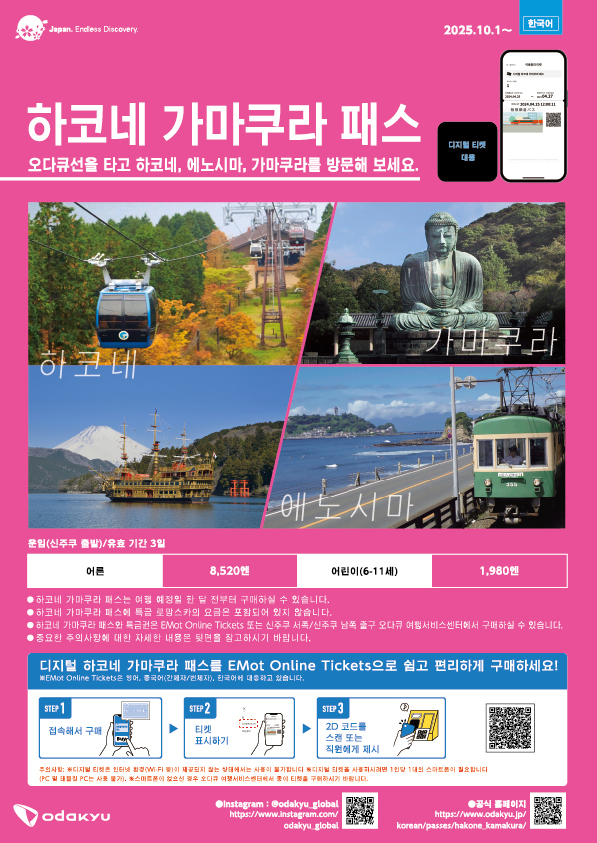 이 코스는 일본의 대표적인 관광지인 하코네와 가마쿠라를 모두 충분히 즐기고 싶은 여행자에게 완벽한 일정입니다.