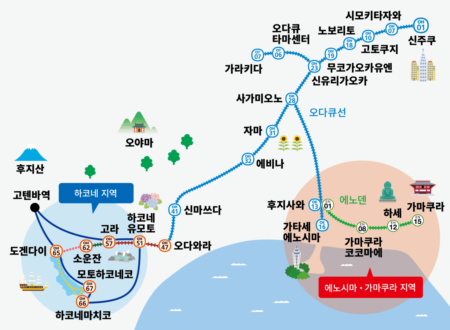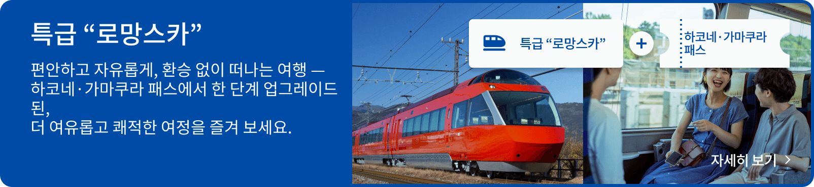 * 오다와라 ↔ 하코네유모토 구간의 지정석 승차권은 당일 잔여 좌석이 있을 경우에만 승강장에서 구매할 수 있습니다.