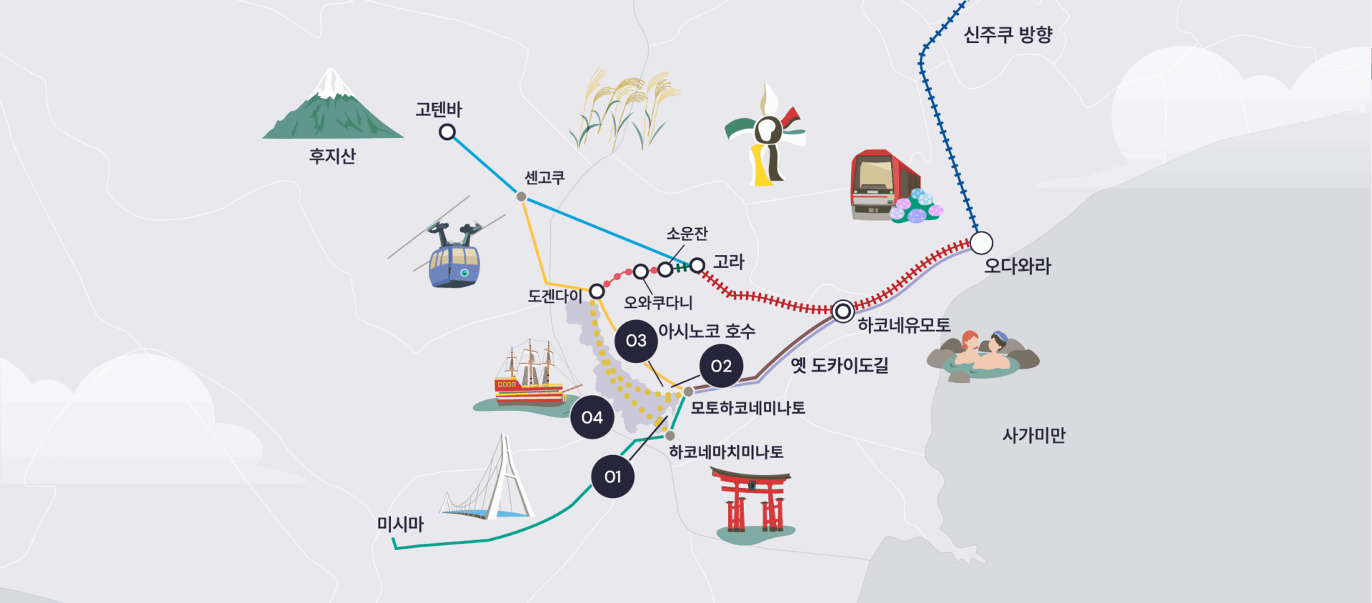 하코네 당일치기 대표 코스입니다. 하코네의 핵심 명소가 모두 포함되어 있어 지역의 매력을 충분히 즐길 수 있습니다. 하코네 프리패스를 이용하면 더욱 경제적으로 여행할 수 있습니다.