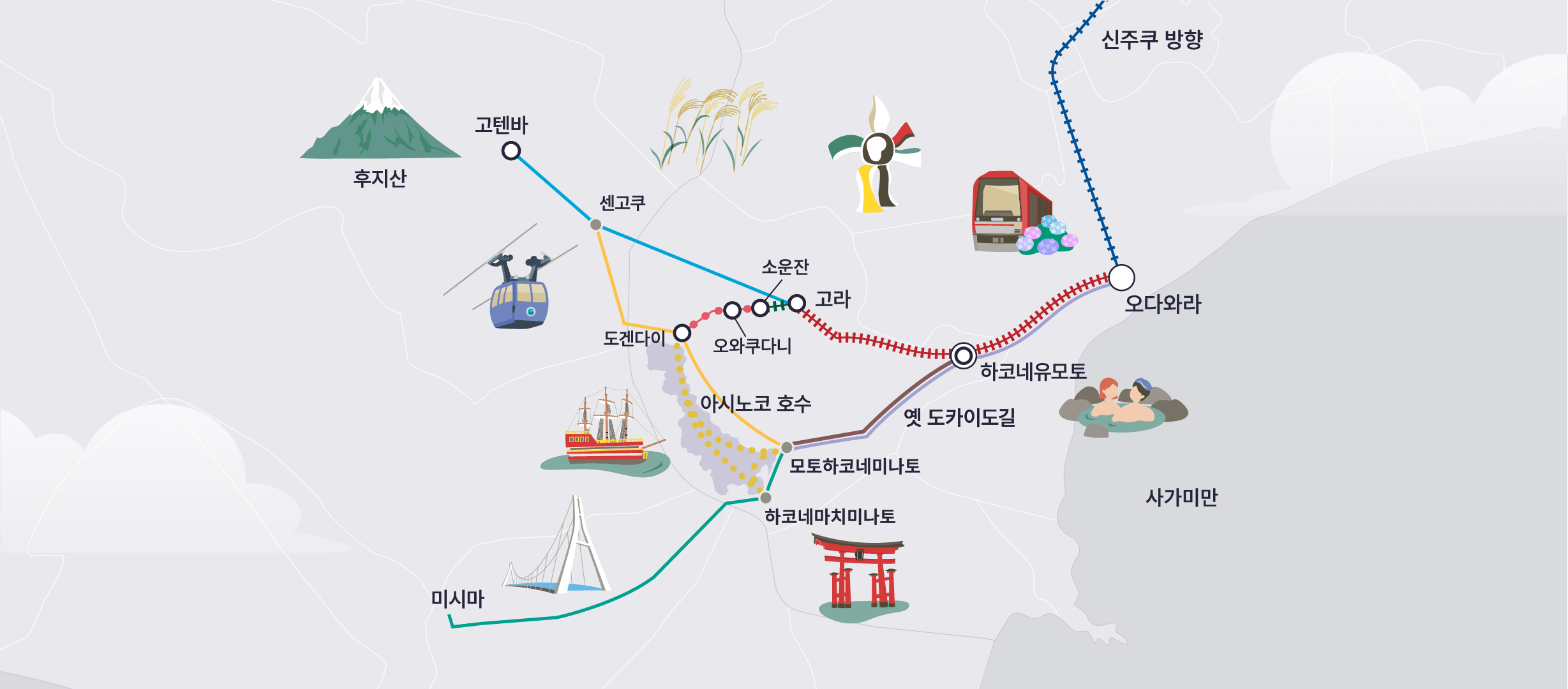 - 온천, 로프웨이, 호수 유람 등 인기 있는 하코네 명소를 탐험하세요.