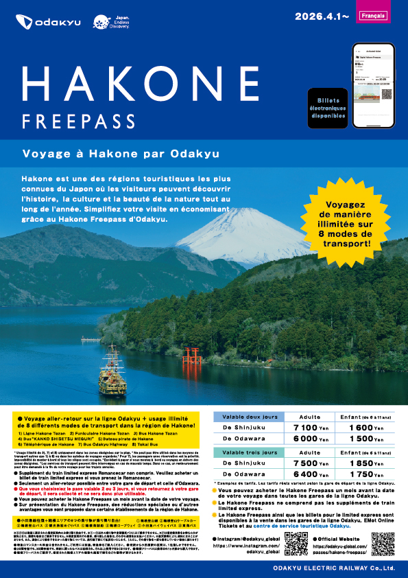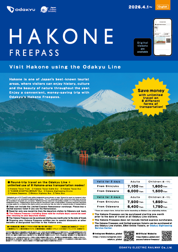 The Hakone Freepass, the Enoshima-Kamakura Freepass, the Tanzawa-Oyama Freepass and tickets for Odakyu Lines can be purchased from ticket vending machines at stations and online. Passes such as the Fuji Hakone Pass cannot be purchased from a ticket vending machine or online and some passes are available only at Odakyu Sightseeing Service Centers.