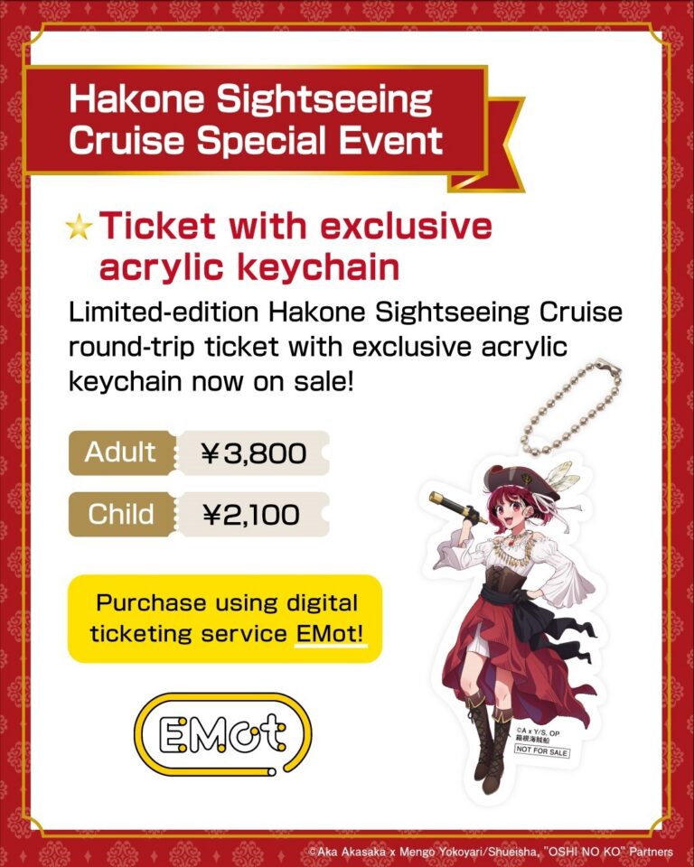 Guests holding tickets that include Hakone Sightseeing Cruise boarding, such as a One-Way Ticket or the Hakone Freepass, are also welcome to join the onboard event. If you are not looking to receive the acrylic keychain, these standard tickets offer another way to enjoy the collaboration.