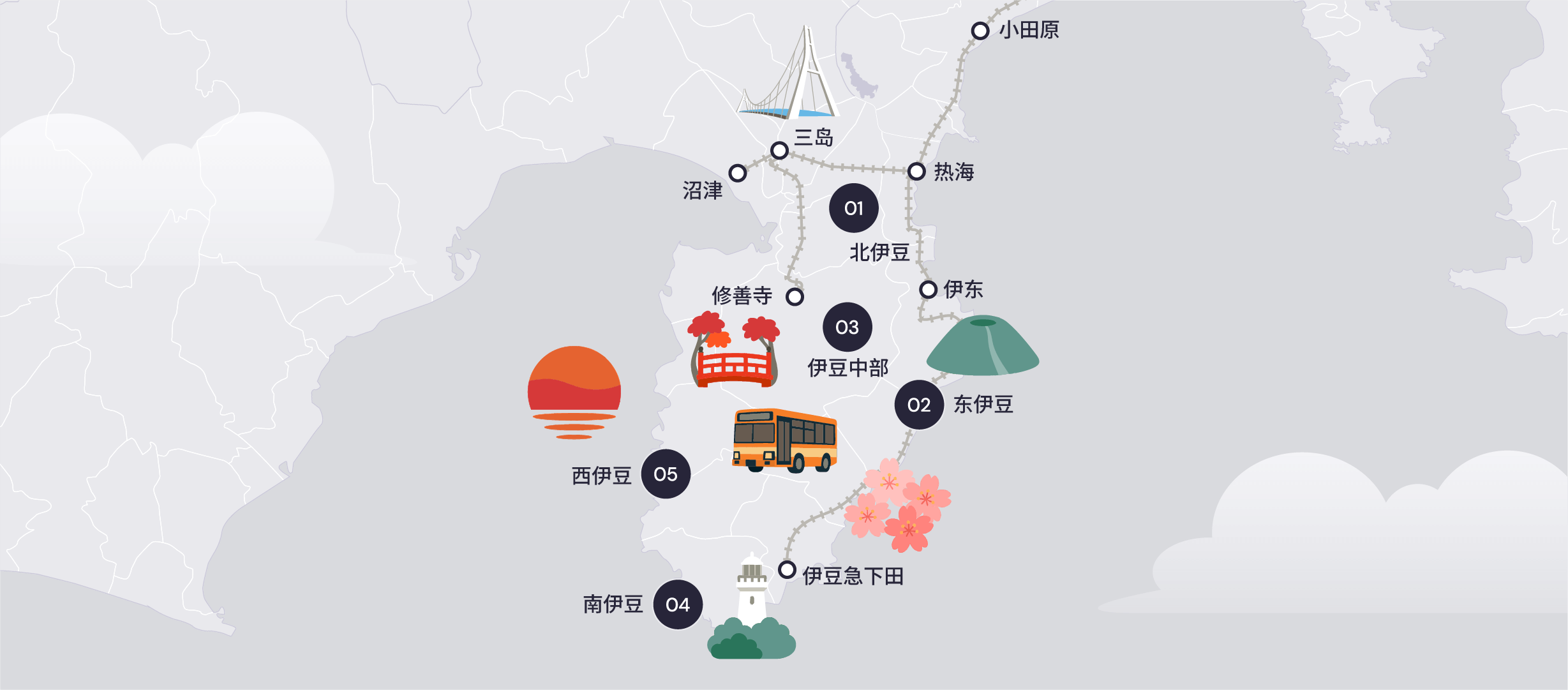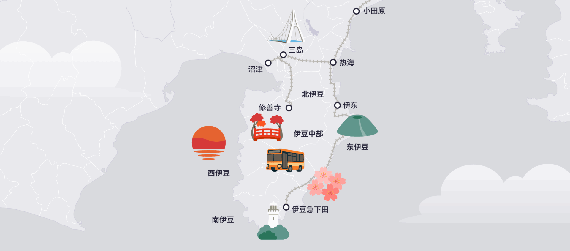 位于静冈县的三岛,过去因东海道沿线的宿场町而繁荣,是一座拥有深厚历史背景的城市。现今最广为人知的景点为日本最长的步行吊桥「三岛 Skywalk」,可一览富士山与骏河湾的壮丽全景。透过新干线网路即可顺利衔接箱根的三岛,融合了丰富的历史、优美的自然风光与便利的现代化交通。