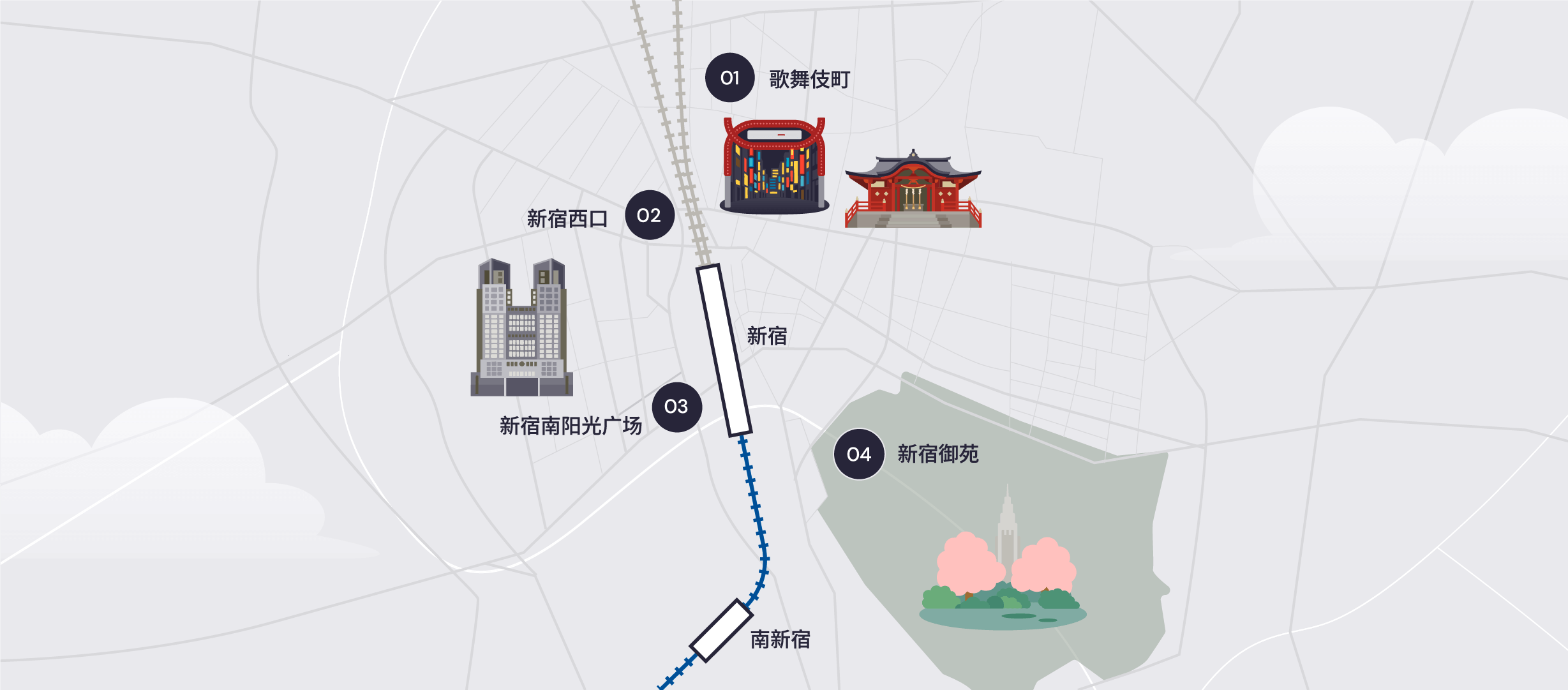 位于南口附近的新宿Southern Terrace与小田急世紀南塔飯店,以开放宽敞、舒适放松的氛围和城市天际线景观著称。这里是继续东京旅程前休息、用餐或住宿的理想地点。