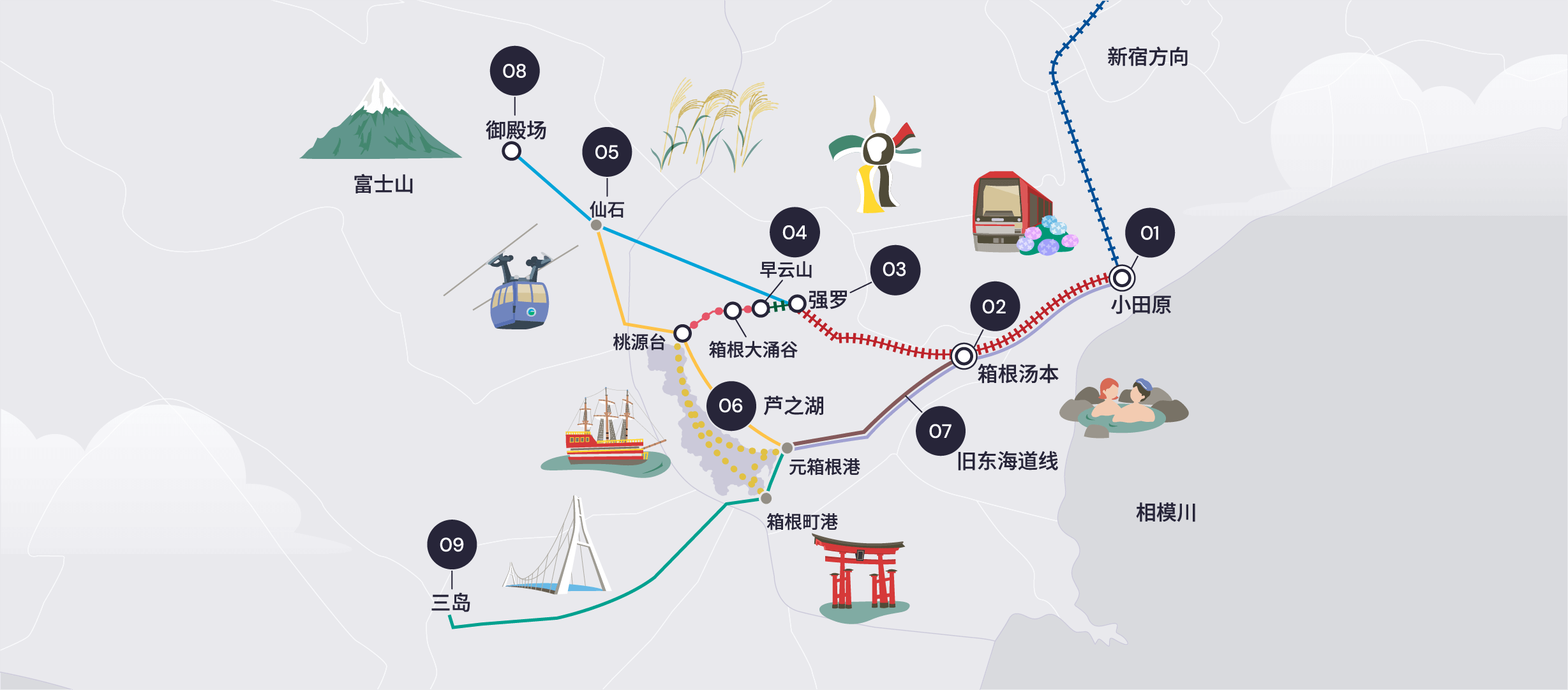 坐落于群山中的温泉度假胜地强罗,是箱根最受欢迎的温泉地区之一,拥有众多传统旅馆与酒店,并以箱根雕刻之森美术馆而闻名。强罗是探索箱根文化与艺术魅力的理想据点。
