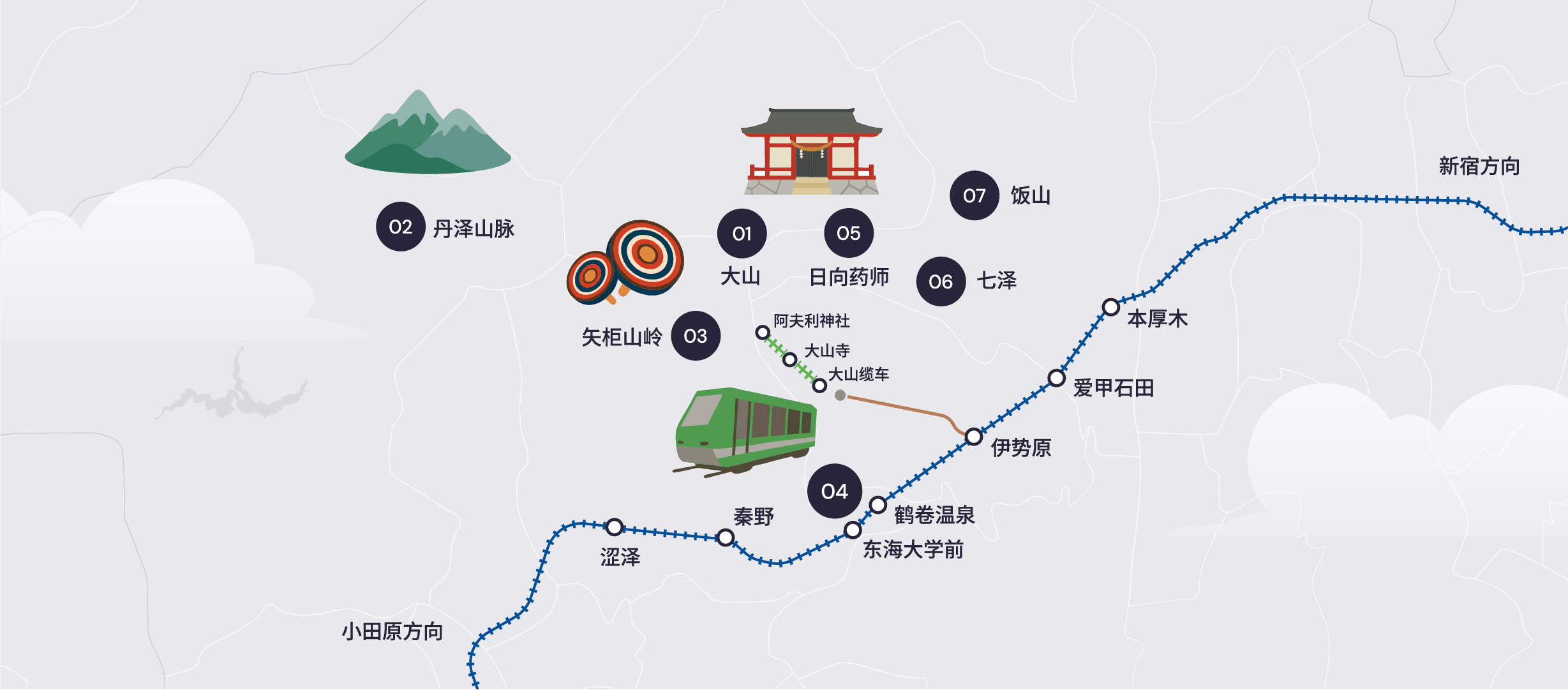 以神圣山岳氛围闻名的大山,是历史悠久的大山阿夫利神社(Oyama Afuri-jinja Shrine)所在地。游客可乘坐缆车前往神社,一览周围群山与相模湾的壮丽景色。附近还有大山寺(Ōyama-dera Temple)与遍布土产店与餐馆的Koma参道(Koma Sando),感受浓厚的传统参拜氛围。