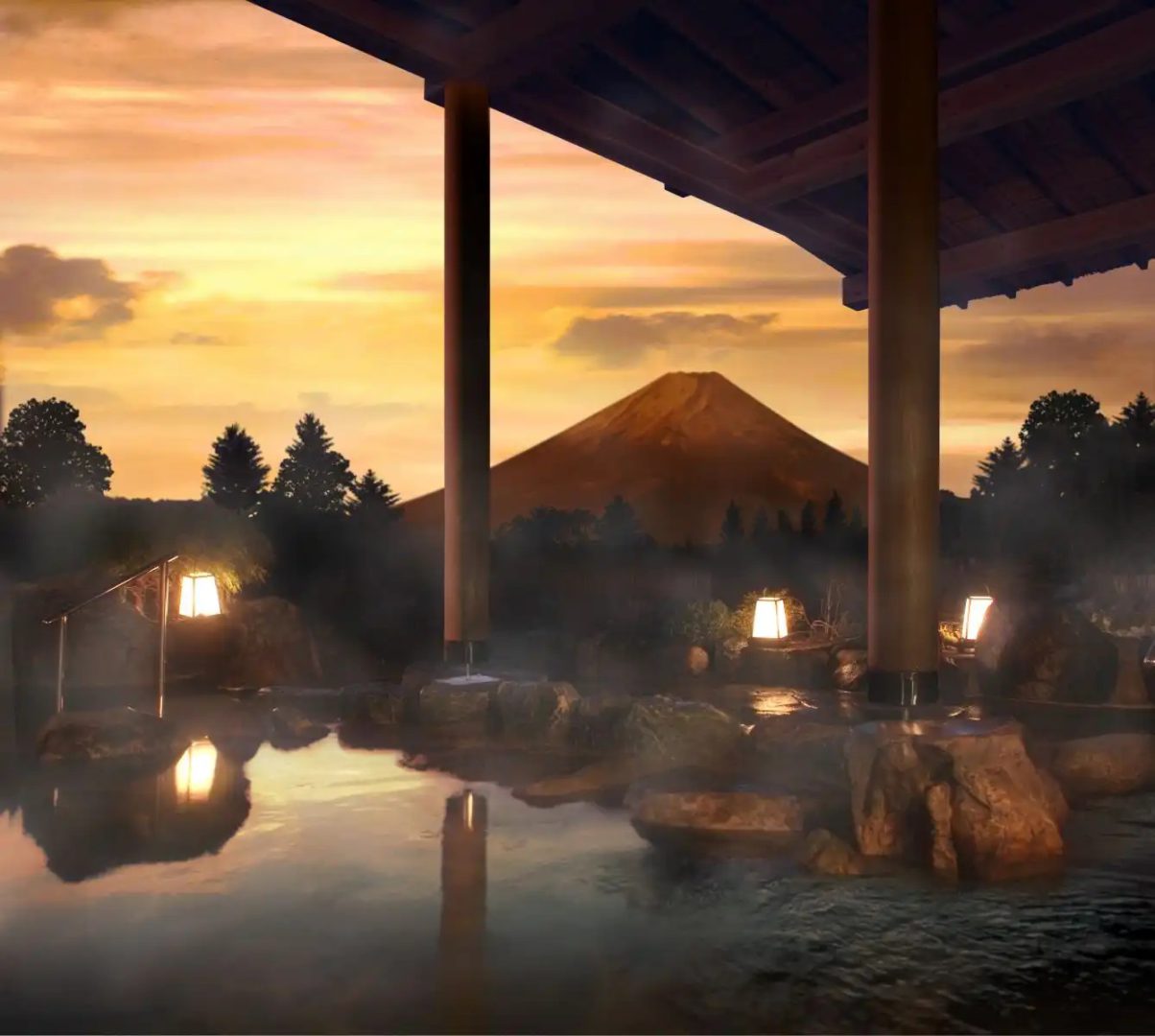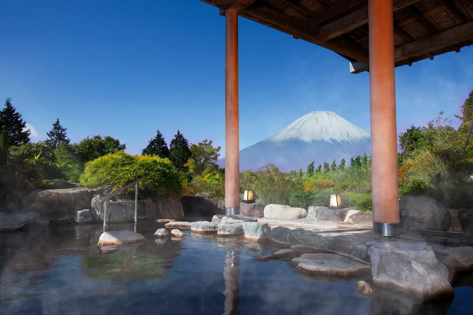 从酒店的露天浴池可饱览富士山全景,享受极致放松的体验。著名的仙石原温泉富含偏硅酸,以其美肤功效而闻名。从女士专用露天浴池可欣赏富士山的壮丽景色。