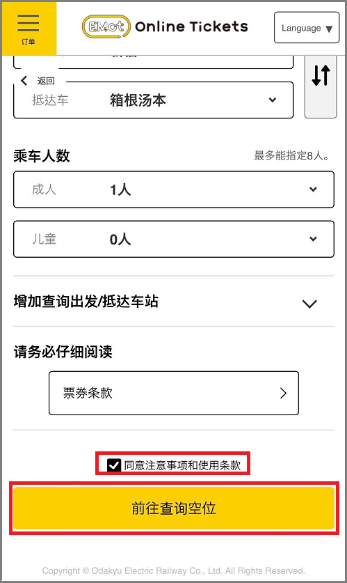 输入乘车日期、时间、区间等各项,阅读票券条款后,勾选复选框,点击下方的“前往查询空位”。