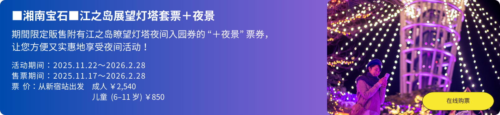 - 在江之岛展望灯塔举办夜间活动期间,提供包含夜间入园券的便利超值“+夜景”票券。