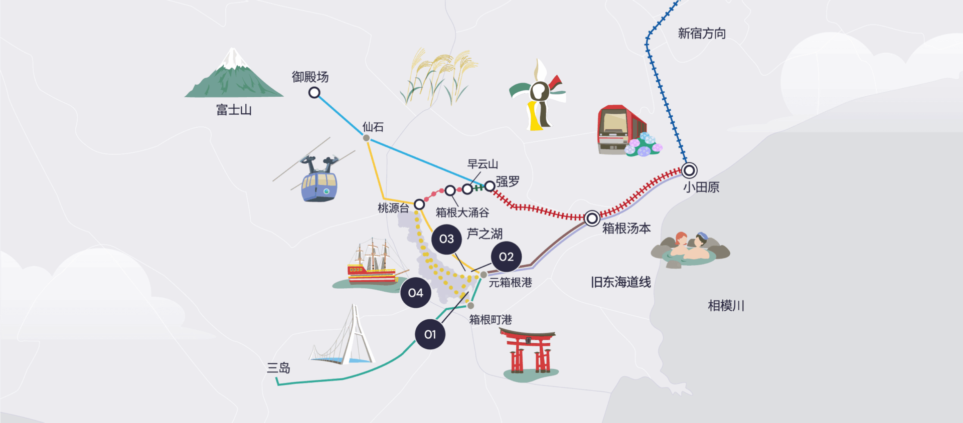 这是经典的箱根一日游路线。行程涵盖箱根必去景点,让您尽情感受此地的独特魅力。使用箱根周游券还能让旅程更加划算。