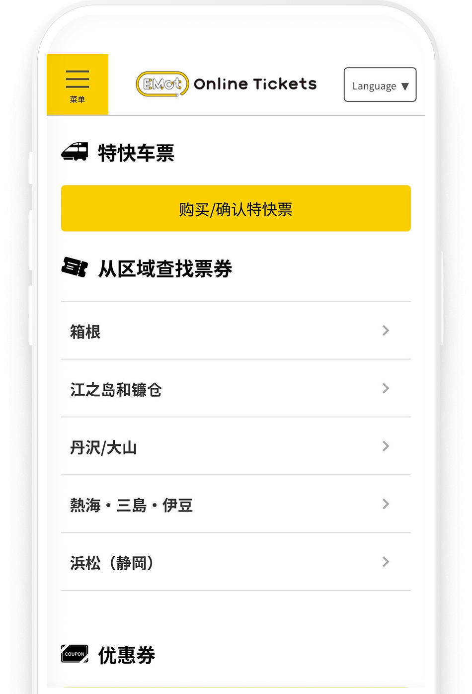 通过 EMot Online Tickets,随时购买小田急优惠周游券:将普通车票与指定区域内特定交通工具的无限次乘坐相结合,为您节省时间与费用。