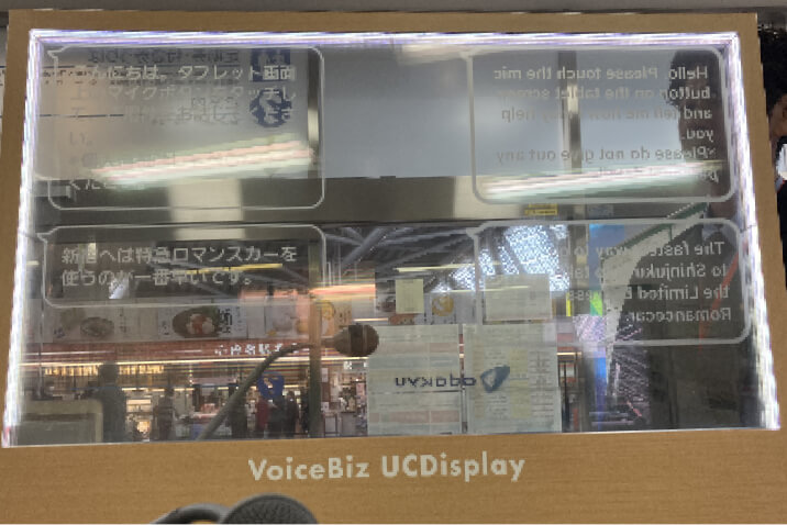 In February 2024, three “VoiceBiz® UCDisplay®” devices, supporting 13 languages, were installed at Shinjuku Station (two locations) and Odawara Station (one location). The system recognizes speech in real time and displays translations as subtitles on a transparent display between the station staff and customer, enabling smooth multilingual communication without app operation.