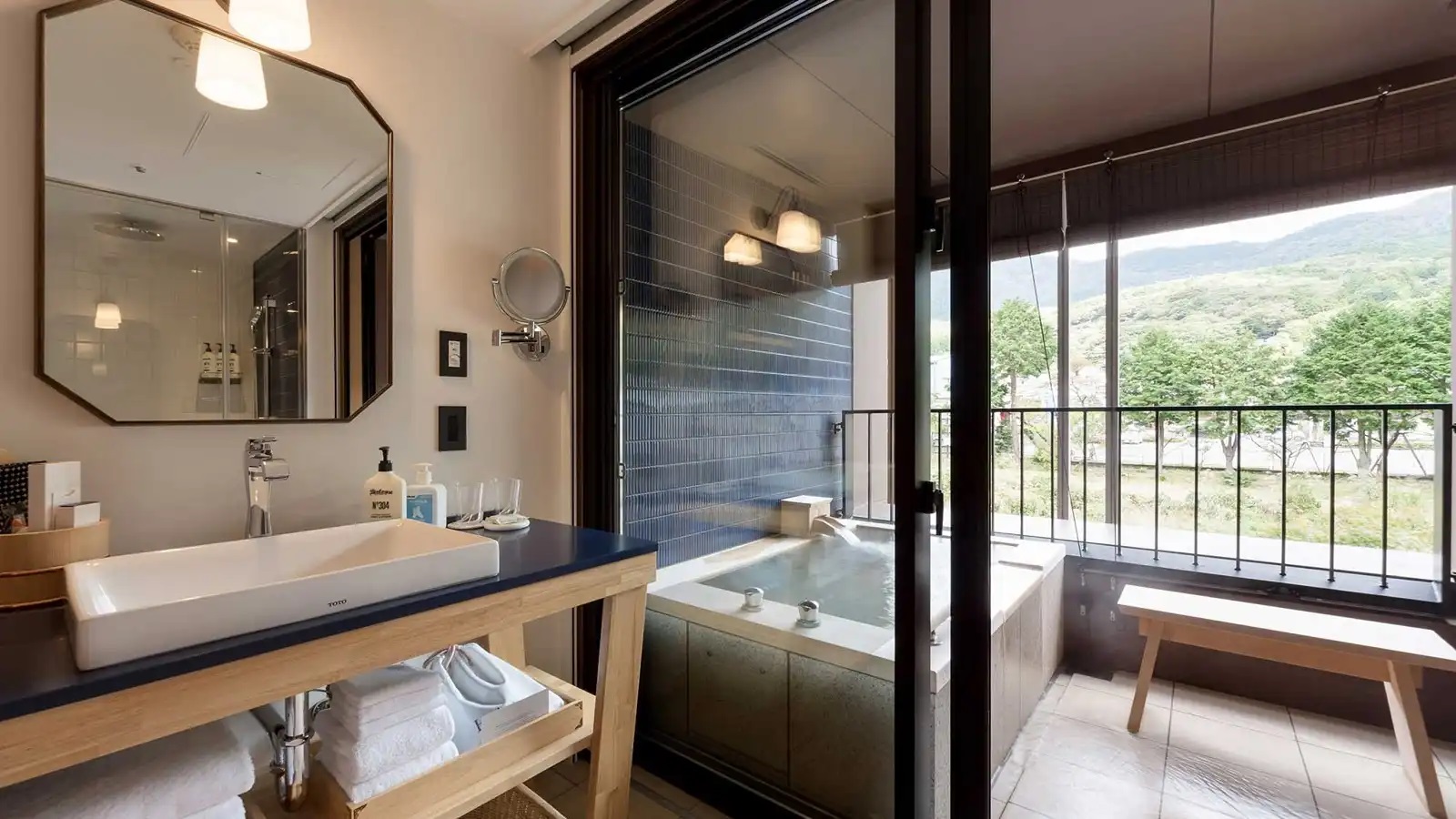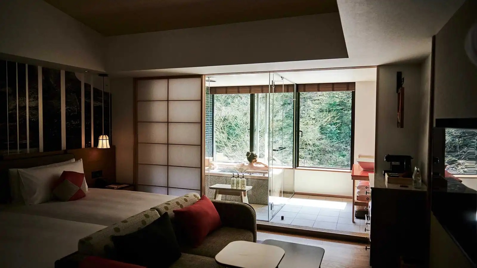 客房的設計靈感來自箱根的自然和文化,更上現代風格而打造的空間。溫馨的燈光和自然元素的融合,營造出輕鬆的氛圍。河畔客房和山景客房均配有天然溫泉水的私人浴池,讓您在私人空間內盡情享受放鬆時光。
