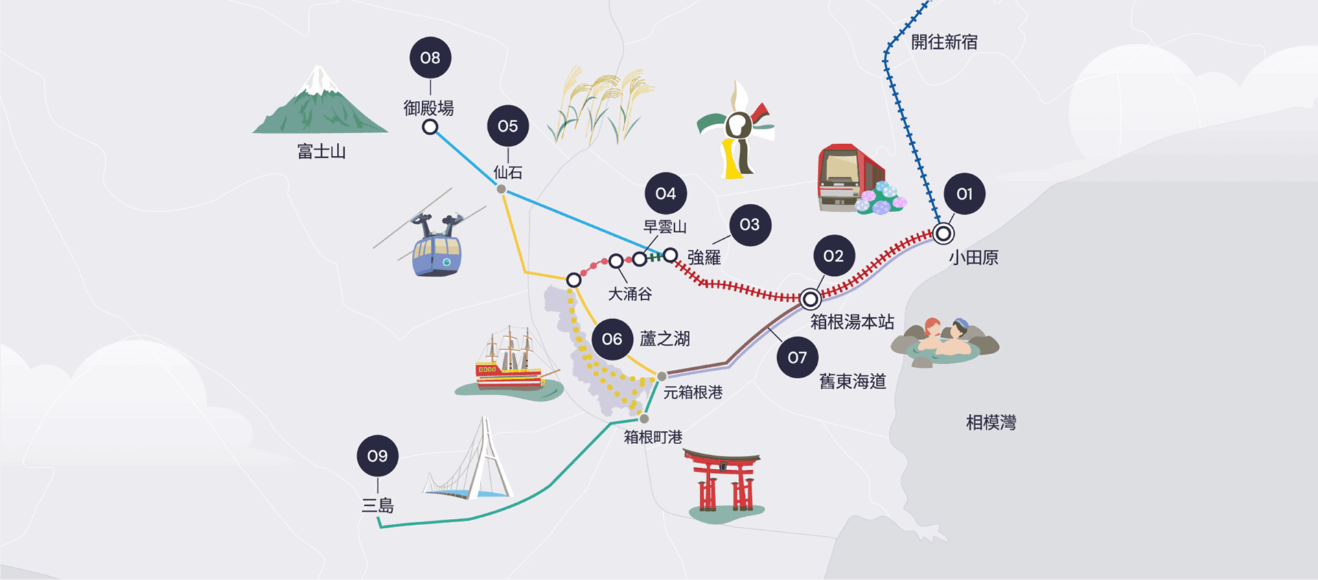 在箱根停留一晚,享受為期兩天的旅程,讓您充分體驗其魅力。浸泡溫泉放鬆身心,享受悠閒時光,沉浸於箱根的自然美景中。