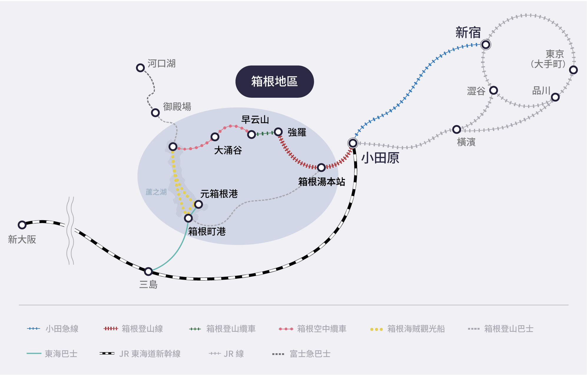 從新宿到箱根的移動,搭乘浪漫特快非常方便。從新宿直達箱根湯本約需80分鐘。由於全車廂都是指定座位,所以可以在舒適的環境中度過到達目的地的旅程。從寬敞的車窗中,可以欣賞到都市風景、河流、山脈、田園風光等不斷變化的景色,請享受吧!