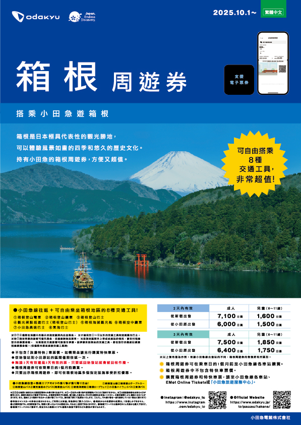 小田急東京Metro地鐵周遊券是可自由乘坐東京Metro地鐵全線和新宿站~代代木上原站間的小田急線,以及小田急線來回車票所組成的超值周遊券。出示周遊券,還可在東京都內眾多的觀光景點及餐飲店等設施享受優待折扣。有效期僅有1天,周遊券金額依小田急線的出發車站而異。小田急線各站(新宿~代代木上原間除外)的售票機和窗口,以及小田急旅行各營業處皆可購買。(部分營業處沒有銷售) 詳細情形請向小田急線窗口的承辦人員洽詢。