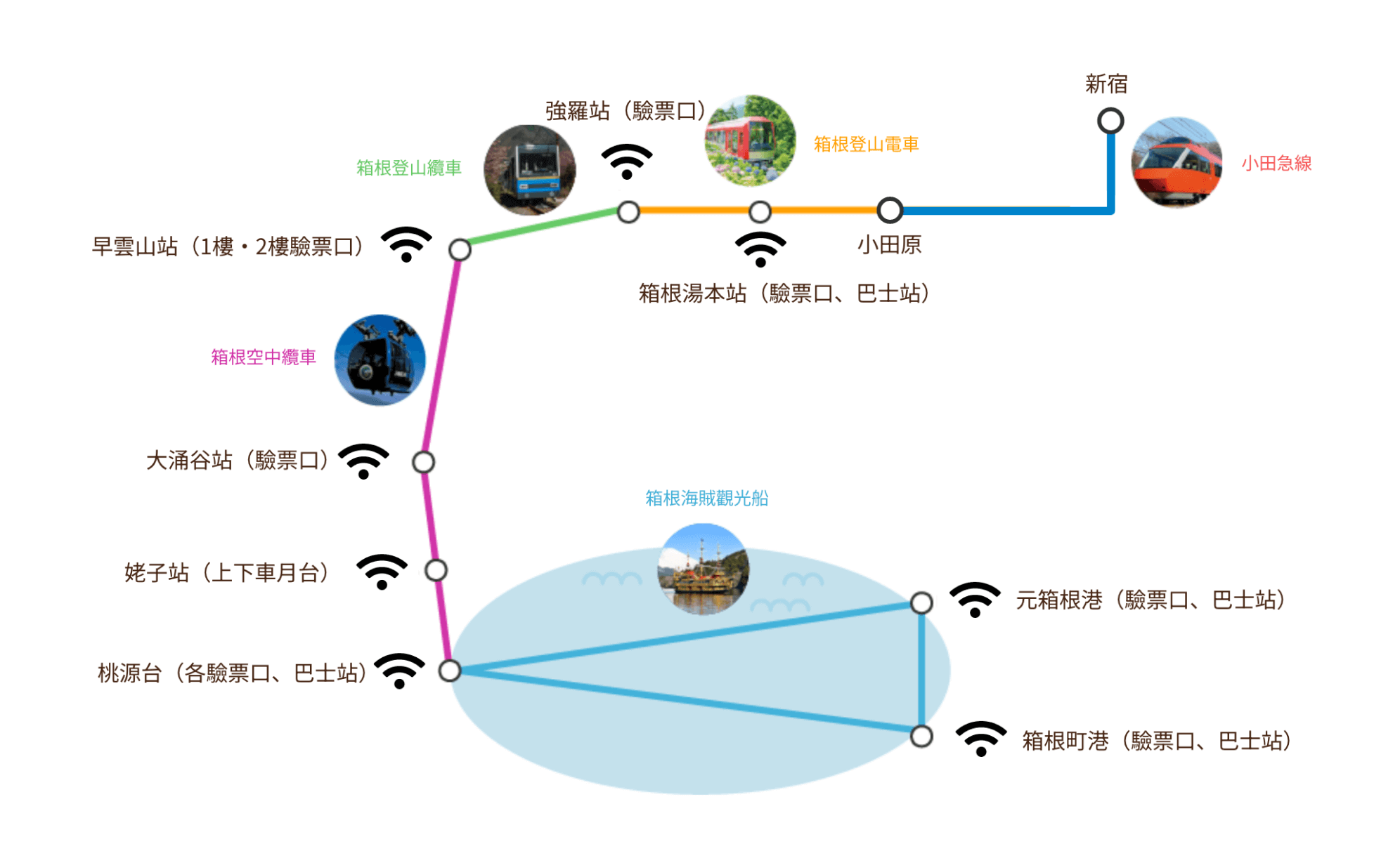 我們在箱根湯本站等八個地點的售票口和公車站提供免費Wi-Fi “ODAKYU HAKONE FREE Wi-Fi”。國內外來訪箱根的遊客都可以享受高速,舒適的無限網路。