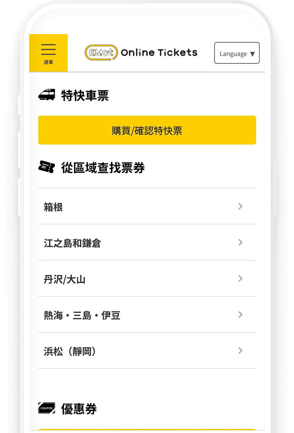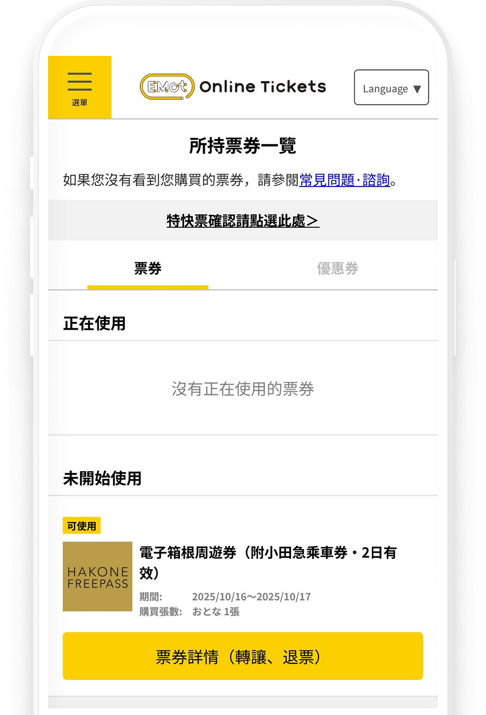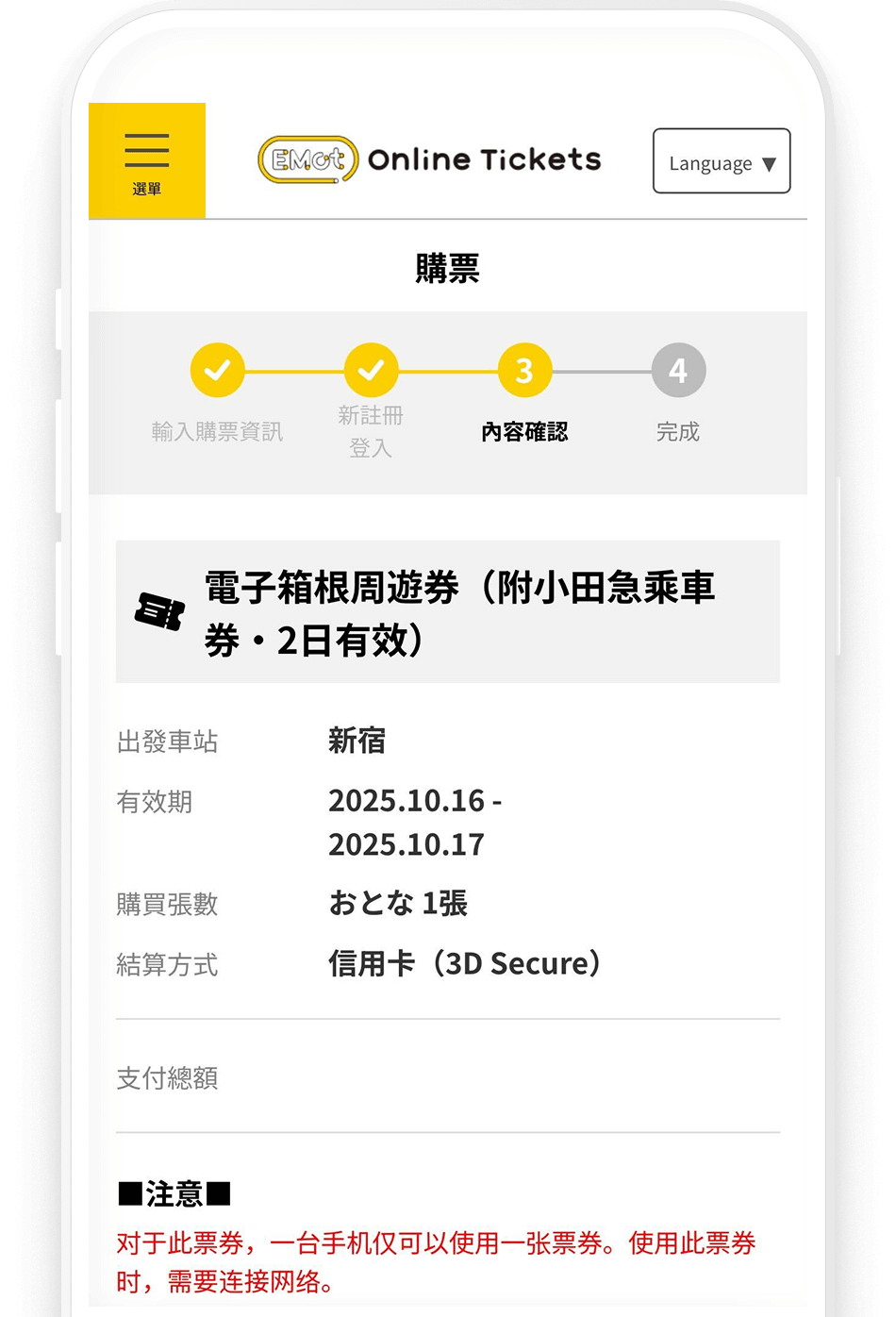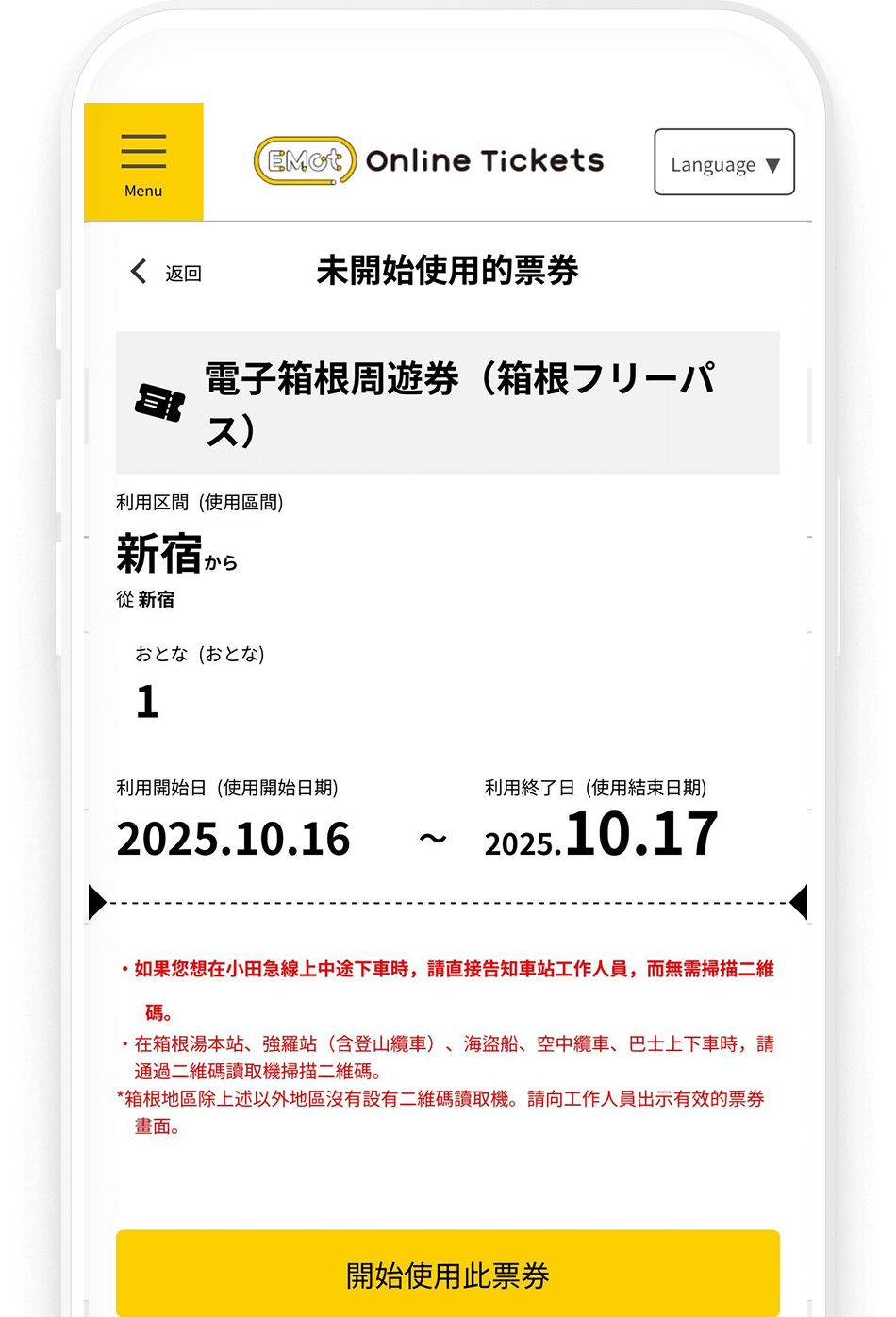 透過 EMot Online Tickets,隨時購買小田急優惠周遊券:
