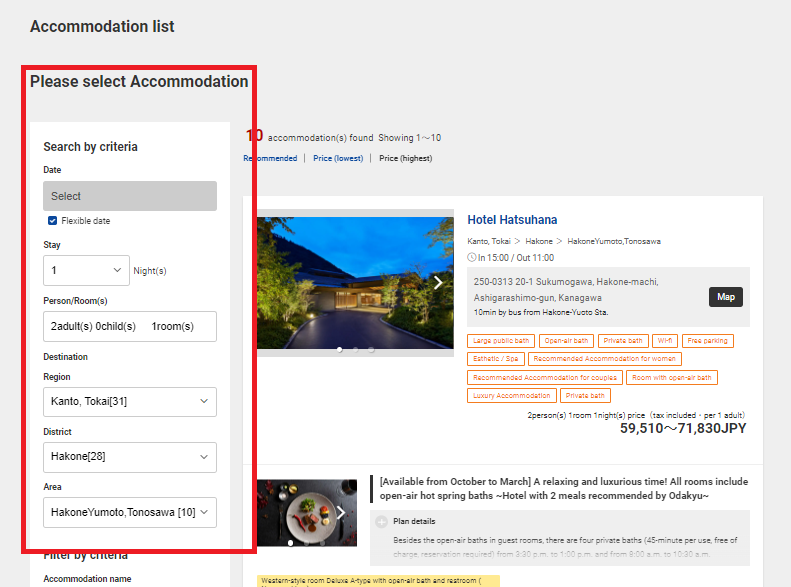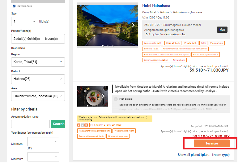 นอกจากฮาโกเน่แล้ว คุณยังสามารถจองโรงแรมและที่พักในพื้นที่ยอดนิยมอย่างโกเท็มบะ เอโนชิมะ คามาคุระ และโรงแรมในชินจูกุได้อีกด้วย