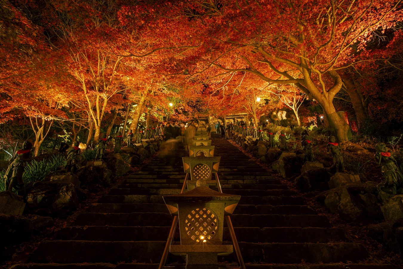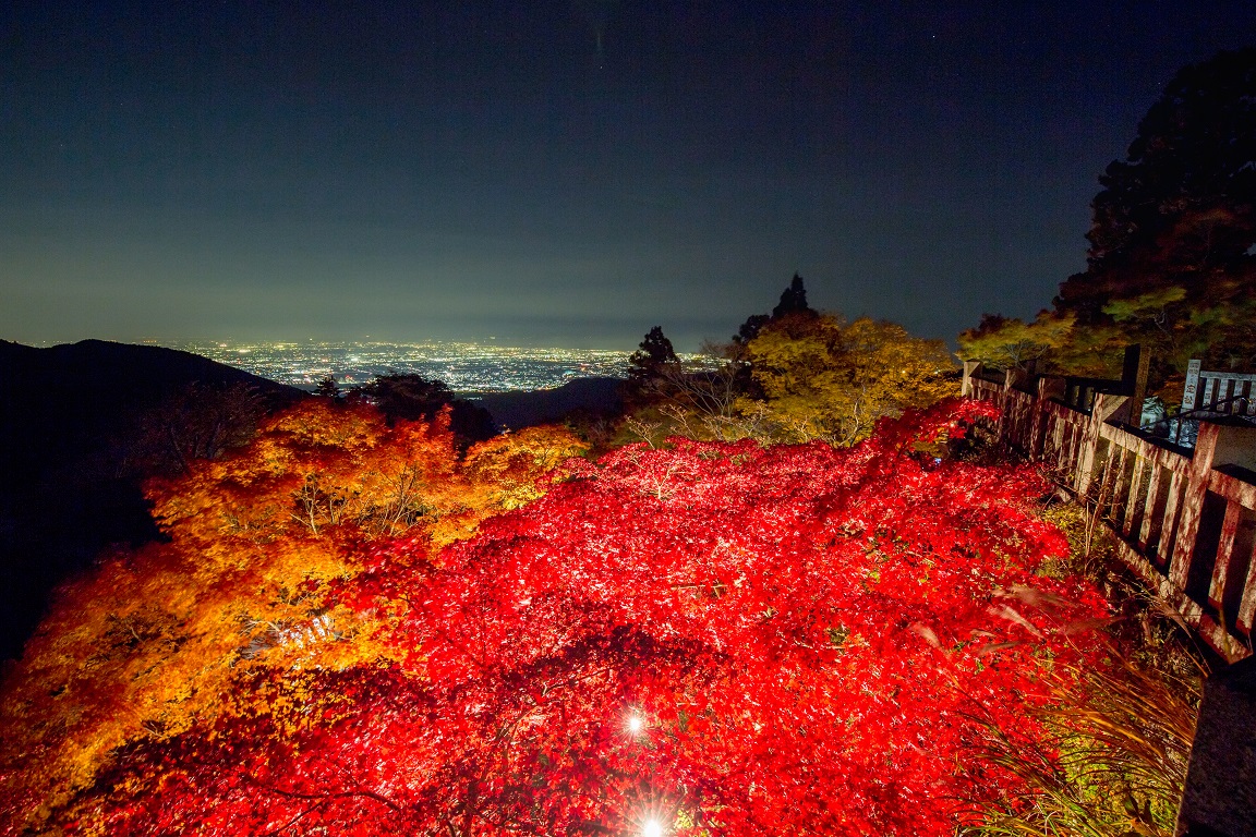 เพลิดเพลินไปกับวิวใบไม้เปลี่ยนสีที่ประดับไฟอย่างสวยงามตระการตา และทิวทัศน์ยามค่ำคืนของพื้นที่โชนันที่มองเห็นได้จากศาลเจ้าโอยามะ อะฟุริ ชิโมฉะ