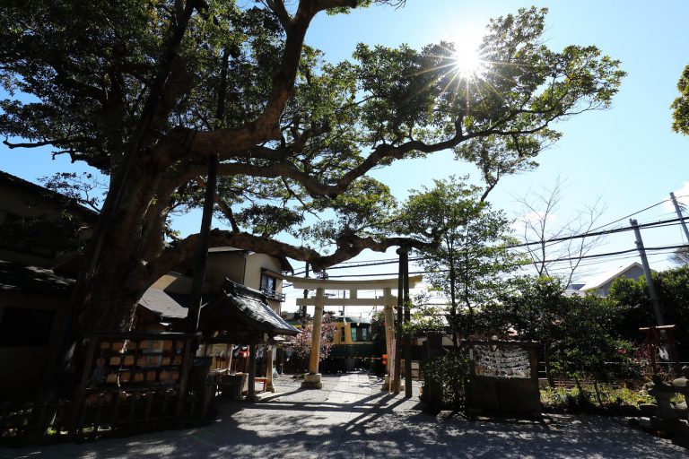 ศาลเจ้าแห่งนี้ถูกสร้างขึ้นเพื่อสักการะ คามาคุระ คาเงมาสะ นักรบผู้กล้าในช่วงปลายสมัยเฮอัน (ค.ศ. 1083-1087) ที่นี่ถือเป็นหนึ่งในสถานที่สักการะเจ็ดเทพแห่งโชคลาภของคามาคุระ และเป็นที่รู้จักกันในชื่อ "ศาลเจ้าโกะเรียว" ภาพของรถไฟเอโนะเด็นที่วิ่งผ่านหน้าโทริอิ และภาพของรถไฟเอโนะเด็นที่แต่งแต้มด้วยสีสันของดอกไฮเดรนเยียในบริเวณศาลเจ้าและพื้นที่โดยรอบนั้น ถือเป็นภาพทิวทัศน์ที่ได้รับความนิยมเป็นอย่างมาก ภายในศาลเจ้าไม่อนุญาตให้ถ่ายภาพ ดังนั้นผู้มาเยี่ยมชมสามารถมาชื่นชมดอกไฮเดรนเยียภายในศาลเจ้า และถ่ายภาพได้เฉพาะบริเวณด้านนอกของศาลเจ้าเท่านั้น