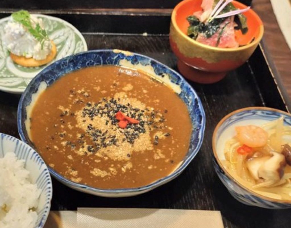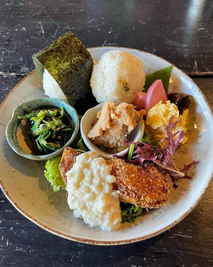 เมนูอาหารกลางวันมีข้าวปั้น พร้อมทั้งเมนูจานหลักและจานเคียงจัดวางไว้อย่างสวยงาม และยังมีชุดข้าวแกงกะหรี่ที่ใช้ข้าวกล้องหมักสาเกเป็นวัตถุดิบหลักเสิร์ฟพร้อมผักสดตามฤดูกาลและผักผัดแบบ Sauté นอกจากนี้ ยังมีชาออร์แกนิกและของหวานให้เพลิดเพลินได้อย่างเต็มที่ โดยเมนูทั้งหมดมีรสอ่อนและดีต่อสุขภาพ