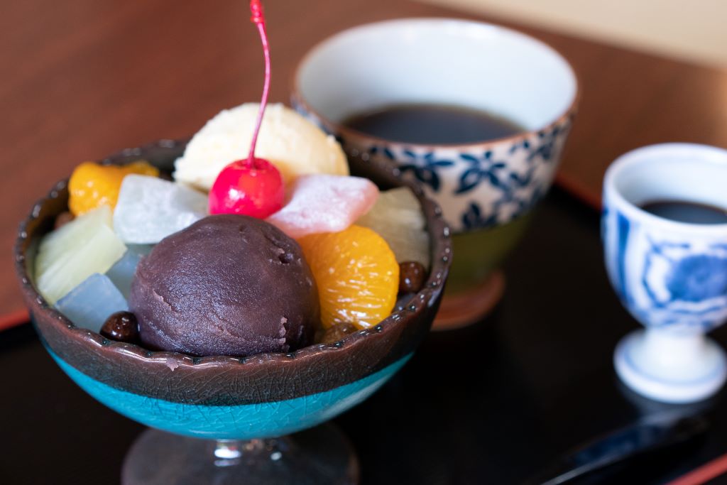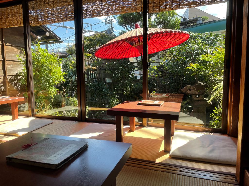 จากภายในร้านที่ปูด้วยเสื่อทาทามิ สามารถมองเห็นสวนที่มีดอกไม้เบ่งบานตามฤดูกาล และรถไฟสายเอโนะเด็นที่วิ่งผ่านด้านหน้าสวนได้ ภายในห้องสไตล์ญี่ปุ่นมี "โทโคโนมะ" ที่แขวนภาพม้วนและจัดดอกไม้เข้ากับฤดูกาล บางครั้งยังมีการตกแต่งตามเทศกาล ทำให้คุณได้มีโอกาสสัมผัสกับวัฒนธรรมญี่ปุ่นแบบดั้งเดิมที่งดงาม แม้ว่าคาเฟ่แห่งนี้จะมีขนมหวานเป็นเมนูหลัก แต่ก็มีเมนูโอฉะสึเกะ (อาหารญี่ปุ่นแบบดั้งเดิมที่ราดน้ำซุปลงไปบนข้าว) สำหรับคนที่ท้องว่างด้วยเช่นกัน โดยมีให้เลือก 4 แบบคือ บ๊วย สาหร่ายคมบุ สาหร่ายโนริ และแซลมอน การรับประทานโอฉะสึเกะในบรรยากาศที่เหมือนภาพวาดญี่ปุ่นโบราณนี้ ทำให้เมนูยิ่งมีรสชาติที่พิเศษมากยิ่งขึ้น