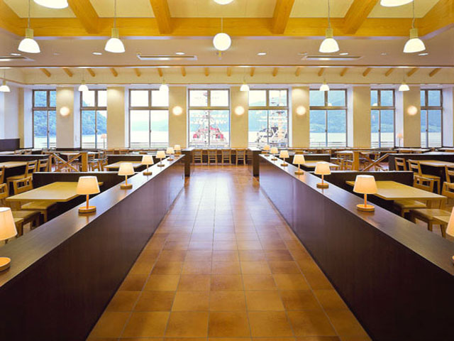 มาถึงท่าเรือโทเง็นไดแล้วก็แวะทานอาหารกลางวันที่ร้านอาหารโทเง็นไดวิว ที่นี่มีเมนูอาหารย่างแบบดั้งเดิมที่ปรุงด้วยวิธีย่างถ่านและอาหารสไตล์ตะวันตกที่ใช้วัตถุดิบจากท้องถิ่น เมนูยอดนิยมคือ ข้าวไข่เจียวนุ่มๆ และสเต็กแฮมเบิร์กเสิร์ฟพร้อมข้าวและไข่จากโกเทมบะ แนะนำให้ลองดื่มเบียร์สดในแก้วถังโจรสลัดและชมวิวเรือโจรสลัดที่แล่นผ่านไปมาในทะเลสาบ