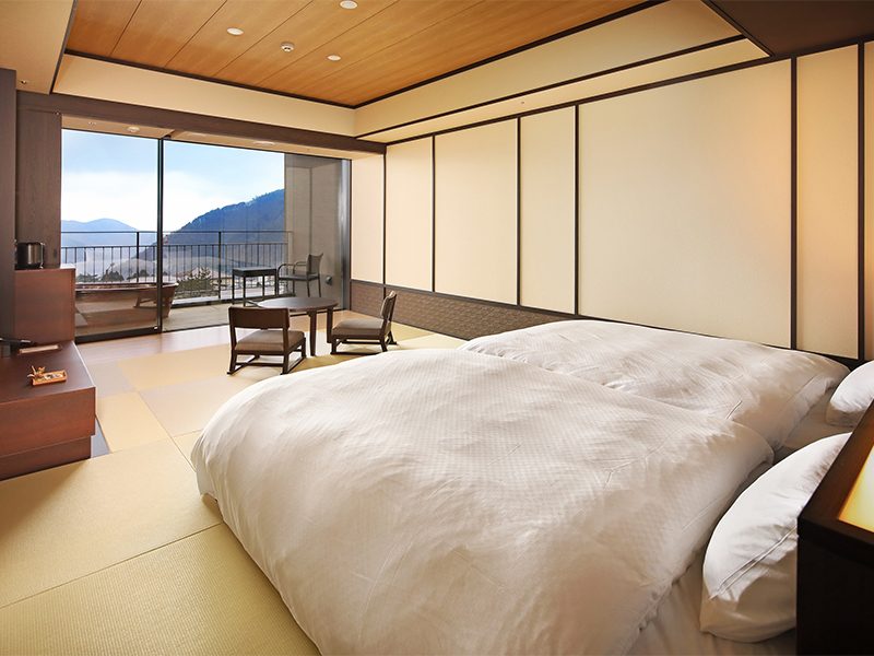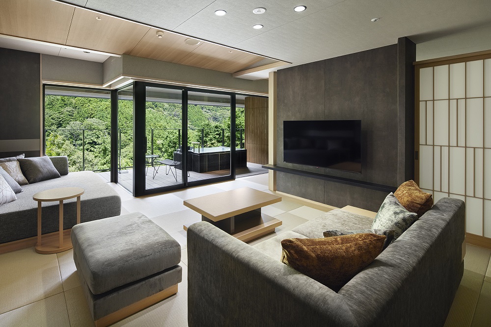 ห้องพักทุกห้องมีพื้นที่เปิดกว้างและระเบียงชมวิว เมื่อมองจากหน้าต่างบานใหญ่หรือระเบียง จะมองเห็นเทือกเขาฮาโกเนะและอ่าวซากามิ เสน่ห์ของที่พักนี้คือผู้เข้าพักสามารถเพลิดเพลินกับวิวพาโนรามาของธรรมชาติอันยิ่งใหญ่ของโกระได้จากภายในห้องพัก การตกแต่งภายในห้องพักจะใช้ไม้เป็นหลักและปูด้วยเสื่อทาทามิ ให้คุณได้ใช้เวลาอยู่ในห้องพักแสนสบายได้อย่างเพลิดเพลิน บ่อน้ำร้อนกลางแจ้งในห้องพักใช้น้ำแร่จากแหล่งน้ำพุร้อนของที่พักโดยตรง ซึ่งมาจากโกระออนเซ็นที่เป็นหนึ่งใน "17 ออนเซ็นแห่งฮาโกเนะ" การแช่น้ำพร้อมชมวิวภูเขาและท้องฟ้าที่เต็มไปด้วยดาราดารดาษถือเป็นช่วงเวลาแห่งความสุขอย่างยิ่ง นอกจากนี้ ผู้เข้าพักยังสามารถรับทรีตเมนต์จากผู้เชี่ยวชาญที่ได้รับการรับรองจาก "Esalen Institute" ของสหรัฐอเมริกาภายในห้องพักได้อีกด้วย