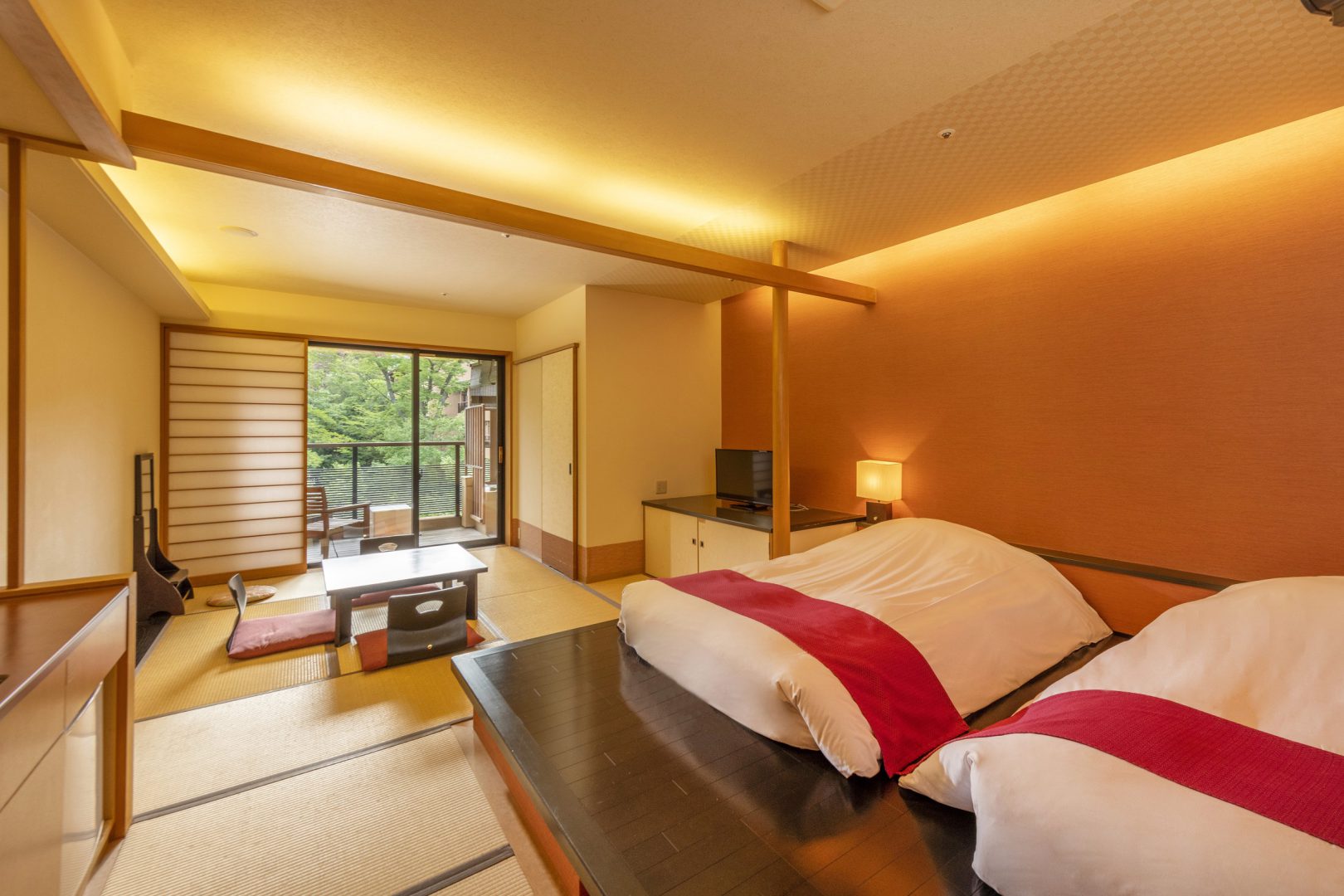 จากประตูทางเข้ามายังล็อบบี้ของที่พักจะถูกปูไว้ด้วยเสื่อทาทามิ ทำให้แขกผู้เข้าพักสัมผัสได้ถึงความนุ่มและอบอุ่นของเสื่อทาทามิใต้ฝ่าเท้า ซึ่งนั่นก็คือจุดเริ่มต้นของการพักผ่อนสุดเอ็กซ์คลูซีฟที่แตกต่างไปจากชีวิตประจำวัน