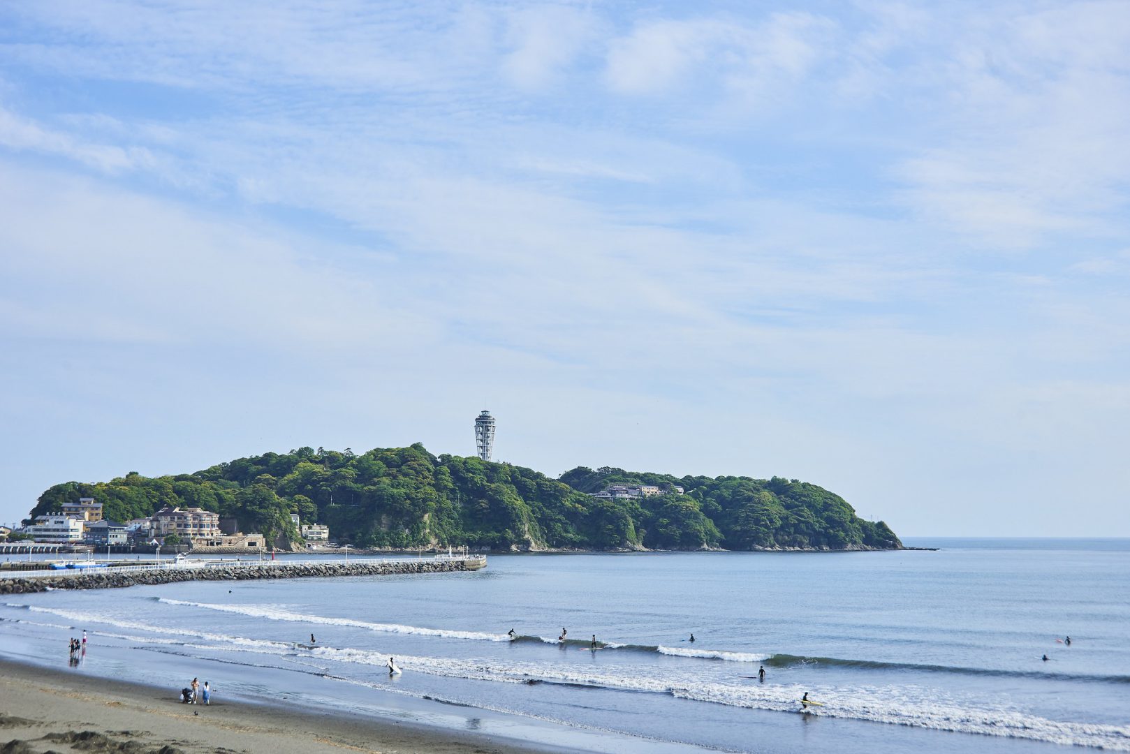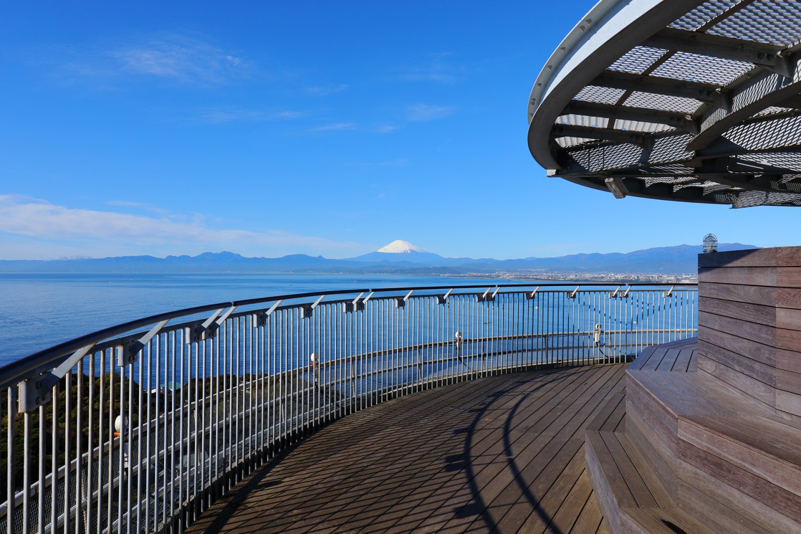 เกาะเอโนชิมะมีบรรยากาศริมทะเลที่คึกคักซึ่งแตกต่างไปจากเสน่ห์เมืองโบราณในคามาคุระ คุณสามารถชมวิวอันงดงามของภูเขาไฟฟูจิและมหาสมุทรจากสะพานเบ็นเต็งบาชิซึ่งเป็นสะพานที่เชื่อมแผ่นดินใหญ่กับเกาะเอโนชิมะ เดินไปตามถนนคนเดินที่พลุกพล่านเรียงรายไปด้วยร้านขายของที่ระลึกและร้านอาหาร ไม่นานก็จะถึงประตูโทริอิสีแดงของศาลเจ้าเอโนชิมะ จากตรงนี้สามารถขึ้นบันไดเลื่อนเอโนชิมะเอสคาร์ (Enoshima Escar) เพื่อไปยังด้านบนเกาะ