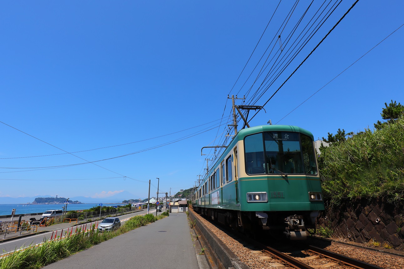 รถไฟเอโนะเด็นวิ่งผ่านเมืองและเลียบริมทะเล จากหน้าต่างรถไฟจะเห็นบ้านเรือนเรียงรายอยู่ริมทางรถไฟ