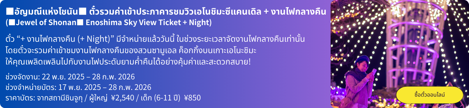 - ในช่วงที่มีการจัดงานไฟกลางคืนที่ สวนซามูเอล ค็อกกิ้ง บนเกาะเอโนะชิมะ จะมีจำหน่ายตั๋ว “+ งานไฟกลางคืน (+ Night)” ซึ่งรวมค่าเข้าชมงานไฟกลางคืนที่ทั้งสะดวกและคุ้มค่า