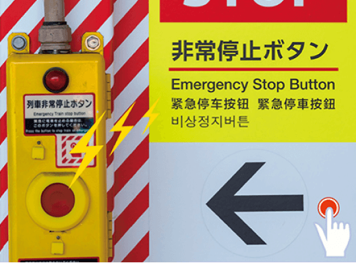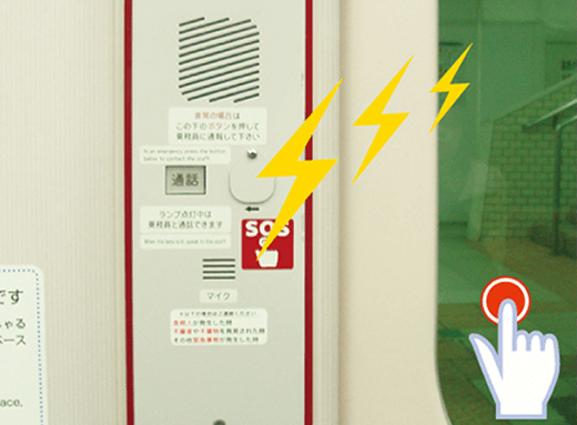 All Odakyu Line station platforms are equipped with an emergency stop button to notify approaching trains of an emergency. When this button is pressed, an emergency signal is transmitted to approaching trains, causing the emergency brakes to apply. (If a train is too close, the emergency brakes may not apply.)